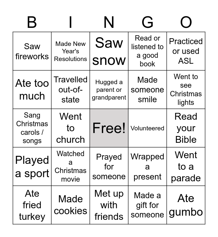 This bingo card has a free space and 29 words: Went to a bonfire, Made cookies, Saw snow, Played cards or a board game, Practiced or used ASL, Saw fireworks, Travelled out-of-state, Hugged a parent or grandparent, Volunteered, Went to a parade, Ate fried turkey, Went to church, Made a gift for someone, Ate gumbo, Sang Christmas carols / songs, Hung out with cousins, Met up with friends, Wrapped a present, Went to see Christmas lights, Played a sport, Watched a Christmas movie, Went to a play, ballet or concert, Made someone smile, Read your Bible, Ate too much, Made New Year's Resolutions, Prayed for someone, Read or listened to a good book and Drew, sketched, or painted something.