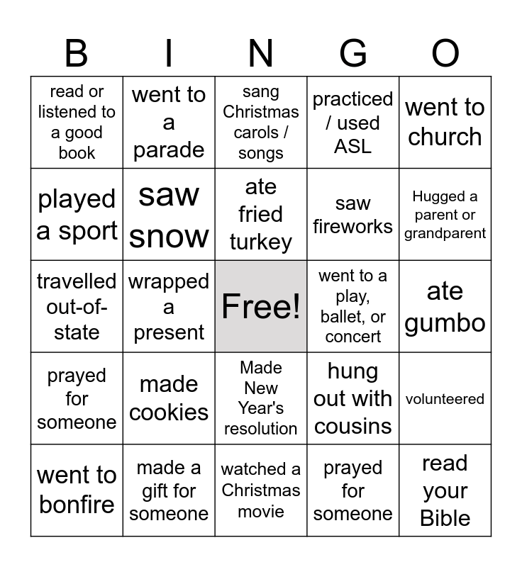This bingo card has a free space and 24 words: went to bonfire, made cookies, ate fried turkey, prayed for someone, went to church, read or listened to a good book, went to a parade, sang Christmas carols / songs, went to a play, ballet, or concert, ate gumbo, travelled out-of-state, saw snow, hung out with cousins, volunteered, played a sport, made a gift for someone, watched a Christmas movie, practiced / used ASL, Hugged a parent or grandparent, prayed for someone, wrapped a present, Made New Year's resolution, saw fireworks and read your Bible.