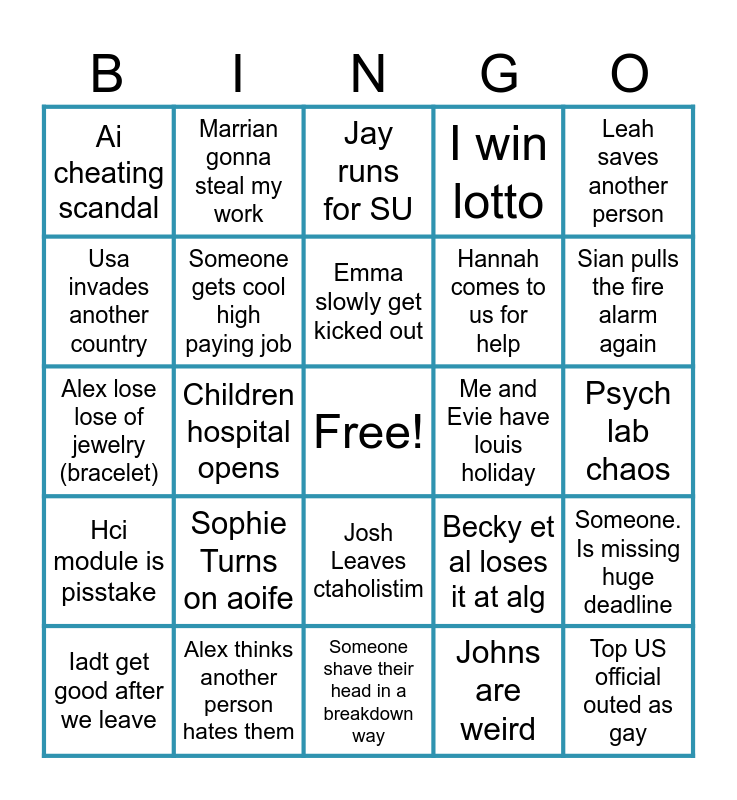 This bingo card has a free space and 24 words: Sophie Turns on aoife, Alex thinks another person hates them, Emma slowly get kicked out, Iadt get good after we leave, Leah saves another person, Ai cheating scandal, Usa invades another country, Marrian gonna steal my work, Me and Evie have louis holiday, Josh Leaves ctaholistim, Hannah comes to us for help, Alex lose lose of jewelry (bracelet), Becky et al loses it at alg, Someone. Is missing huge deadline, Someone gets cool high paying job, Johns are weird, Psych lab chaos, Jay runs for SU, Sian pulls the fire alarm again, Children hospital opens, Top US official outed as gay, Hci module is pisstake, I win lotto and Someone shave their head in a breakdown way.