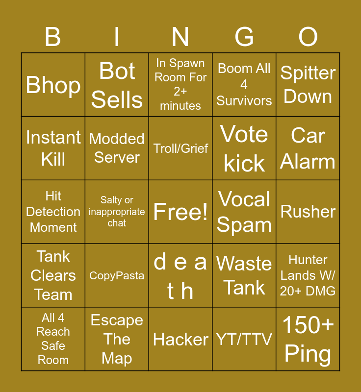 This bingo card has a free space and 27 words: Waste Tank, Rage Quit, Vote kick, Hacker, Instant Kill, In Spawn Room For 2+ minutes, Bot Sells, Tank Clears Team, Vocal Spam, Hunter Lands W/ 20+ DMG, Hit Detection Moment, Boom All 4 Survivors, All 4 Reach Safe Room, Escape The Map, Car Alarm, Server Shuts Down, Modded Server, Troll/Grief, CopyPasta, Bhop, Rusher, YT/TTV, Salty or inappropriate chat, 150+ Ping, d e a t h, Spitter Down and Hit By Tank Throwable.
