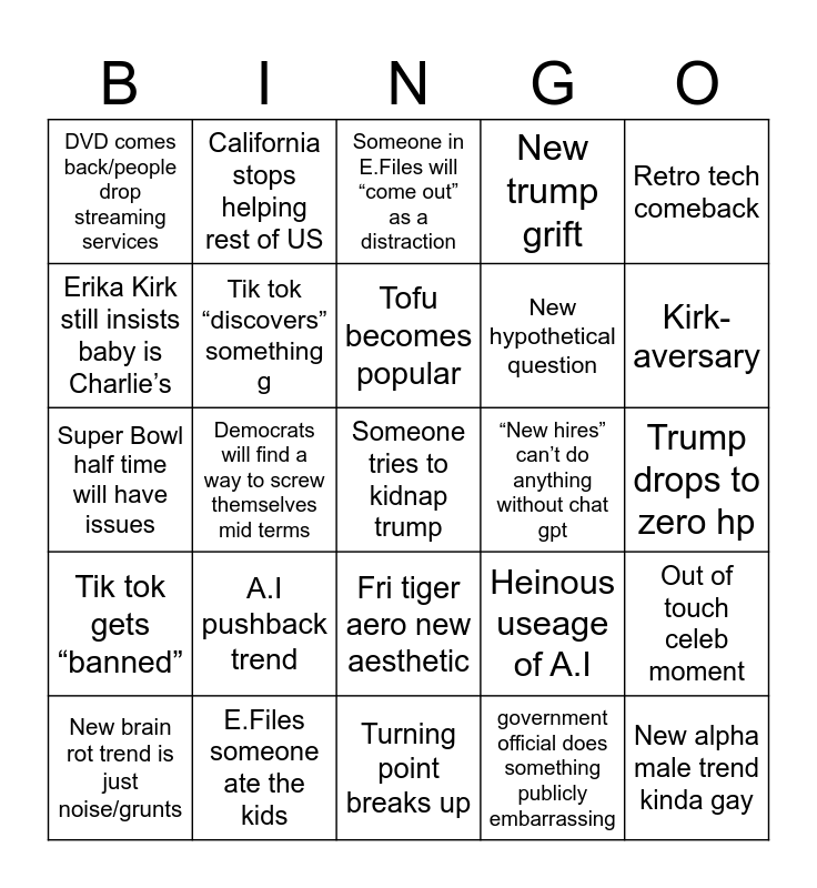 This bingo card has a free space and 24 words: A.I pushback trend, E.Files someone ate the kids, Tofu becomes popular, New brain rot trend is just noise/grunts, Retro tech comeback, DVD comes back/people drop streaming services, Erika Kirk still insists baby is Charlie’s, California stops helping rest of US, “New hires” can’t do anything without chat gpt, Fri tiger aero new aesthetic, New hypothetical question, Super Bowl half time will have issues, Heinous useage of A.I, Out of touch celeb moment, Tik tok “discovers” something g, government official does something publicly embarrassing, Trump drops to zero hp, Someone in E.Files will “come out” as a distraction, Kirk-aversary, Democrats will find a way to screw themselves mid terms, New alpha male trend kinda gay, Tik tok gets “banned”, New trump grift and Turning point breaks up.