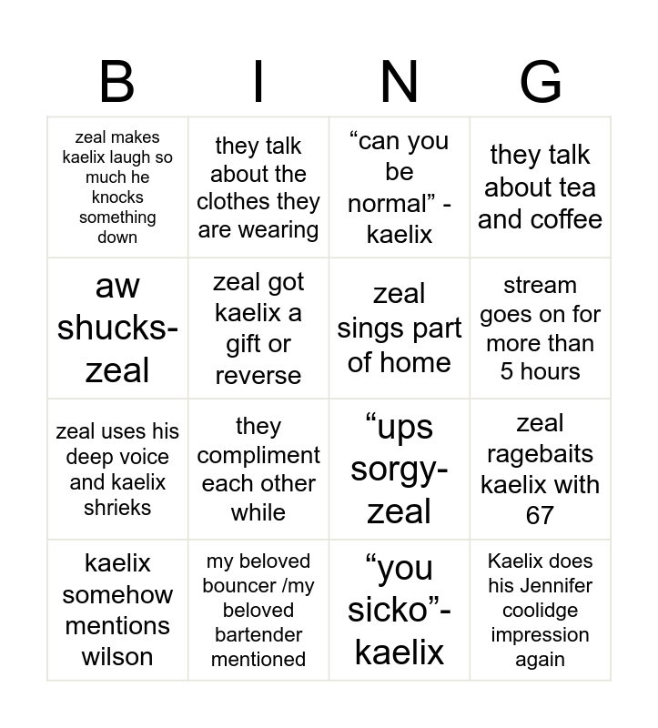 This bingo card has 16 words: my beloved bouncer /my beloved bartender mentioned, zeal ragebaits kaelix with 67, “can you be normal” -kaelix, zeal makes kaelix laugh so much he knocks something down, zeal uses his deep voice and kaelix shrieks, they talk about the clothes they are wearing, “ups sorgy-zeal, “you sicko”-kaelix, aw shucks-zeal, zeal got kaelix a gift or reverse, kaelix somehow mentions wilson, they talk about tea and coffee, they compliment each other while, stream goes on for more than 5 hours, zeal sings part of home and Kaelix does his Jennifer coolidge impression again.
