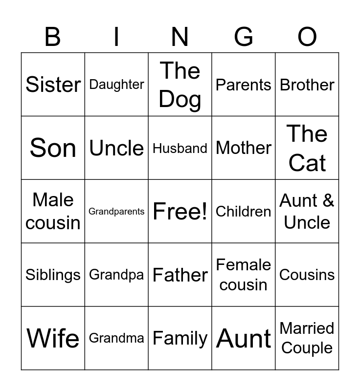 This bingo card has a free space and 24 words: Grandpa, Grandma, Husband, Wife, Brother, Sister, Son, Daughter, Children, Father, Mother, Male cousin, Female cousin, Cousins, Uncle, Aunt, Aunt & Uncle, The Dog, The Cat, Grandparents, Married Couple, Siblings, Parents and Family.