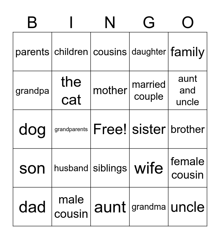 This bingo card has a free space and 24 words: husband, male cousin, mother, dad, family, parents, grandpa, children, sister, siblings, married couple, dog, wife, female cousin, the cat, grandma, brother, cousins, aunt and uncle, grandparents, uncle, son, daughter and aunt.
