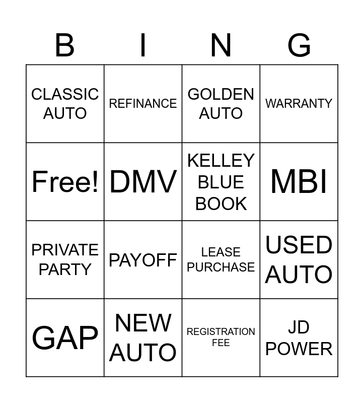 This bingo card has 16 words: NEW AUTO, USED AUTO, GOLDEN AUTO, CLASSIC AUTO, PRIVATE PARTY, REFINANCE, LEASE PURCHASE, REGISTRATION FEE, Free!, DMV, GAP, WARRANTY, PAYOFF, MBI, KELLEY BLUE BOOK and JD POWER.