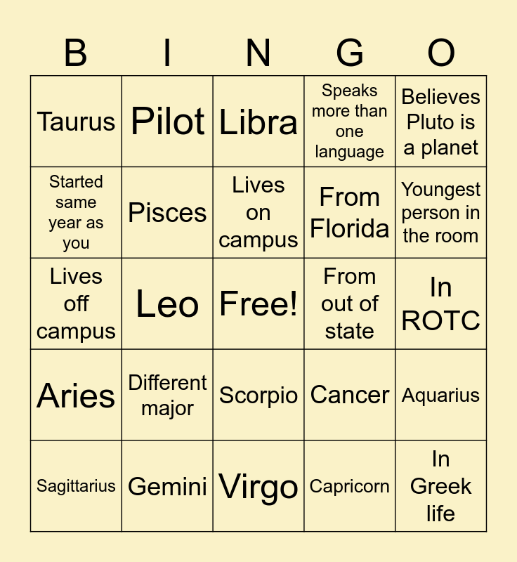 This bingo card has a free space and 24 words: Different major, Gemini, Lives on campus, Sagittarius, Believes Pluto is a planet, Taurus, Started same year as you, Pilot, From out of state, Scorpio, From Florida, Lives off campus, Cancer, Aquarius, Pisces, Capricorn, In ROTC, Libra, Youngest person in the room, Leo, In Greek life, Aries, Speaks more than one language and Virgo.