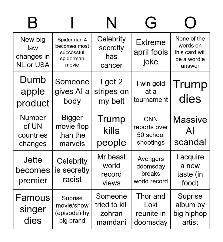 This bingo card has a free space and 24 words: Celebrity is secretly racist, Suprise movie/show (episode) by big brand, I get 2 stripes on my belt, Famous singer dies, None of the words on this card will be a wordle answer, New big law changes in NL or USA, Dumb apple product, Spiderman 4 becomes most successful spiderman movie, CNN reports over 50 school shootings, Mr beast world record views, I win gold at a tournament, Number of UN countries changes, Avengers doomsday breaks world record, I acquire a new taste (in food), Someone gives AI a body, Thor and Loki reunite in doomsday, Massive AI scandal, Celebrity secretly has cancer, Trump dies, Bigger movie flop than the marvels, Suprise album by big hiphop artist, Jette becomes premier, Extreme april fools joke and Someone tried to kill zohran mamdani.