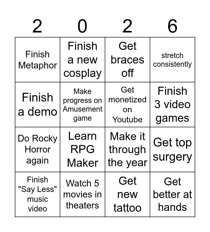 This bingo card has 16 words: Watch 5 movies in theaters, Get top surgery, Get braces off, Finish Metaphor, Do Rocky Horror again, Finish a new cosplay, Make it through the year, Get new tattoo, Finish a demo, Make progress on Amusement game, Finish "Say Less" music video, stretch consistently, Learn RPG Maker, Finish 3 video games, Get monetized on Youtube and Get better at hands.