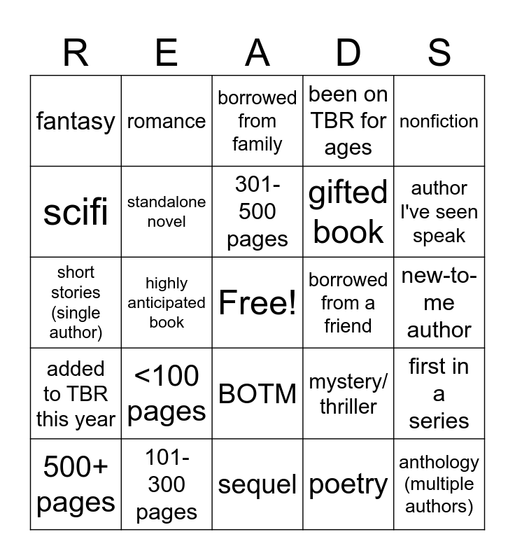 This bingo card has a free space and 24 words: <100 pages, 101-300 pages, 301-500 pages, 500+ pages, nonfiction, fantasy, scifi, romance, borrowed from a friend, BOTM, gifted book, short stories (single author), mystery/ thriller, first in a series, standalone novel, poetry, new-to-me author, borrowed from family, author I've seen speak, highly anticipated book, anthology (multiple authors), added to TBR this year, been on TBR for ages and sequel.