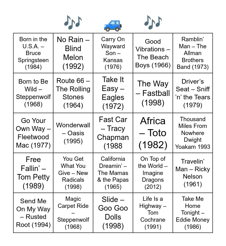 This bingo card has 35 words: Burn Rubber -Why You Wanna Hurt Me-Gap Band (1980), Johnny B. Goode – Chuck Berry (1958), Summertime Blues – Eddie Cochran (1958), Route 66 – The Rolling Stones (1964), California Dreamin’ – The Mamas & the Papas (1965), Good Vibrations – The Beach Boys (1966), Born to Be Wild – Steppenwolf (1968), Fortunate Son – Creedence Clearwater Revival (1969, Take It Easy – Eagles (1972), Sweet Home Alabama – Lynyrd Skynyrd (1974), Go Your Own Way – Fleetwood Mac (1977), Ramblin’ Man – The Allman Brothers Band (1973), Running on Empty – Jackson Browne (1977), Ventura Highway – America (1972), Born in the U.S.A. – Bruce Springsteen (1984), Africa – Toto (1982), Life Is a Highway – Tom Cochrane (1991), Wonderwall – Oasis (1995), Free Fallin’ – Tom Petty (1989), Fast Car – Tracy Chapman (1988, On Top of the World – Imagine Dragons (2012), Send Me On My Way – Rusted Root (1994), Travelin’ Man – Ricky Nelson (1961), Magic Carpet Ride – Steppenwolf (1968), Carry On Wayward Son – Kansas (1976), Driver’s Seat – Sniff ’n’ the Tears (1979), Take Me Home Tonight – Eddie Money (1986), Interstate Love Song – Stone Temple Pilots (1994), The Way – Fastball (1998), Thousand Miles From Nowhere Dwight Yoakam 1993, Float On – Modest Mouse (2004), Slide – Goo Goo Dolls (1998), You Get What You Give – New Radicals (1998), No Rain – Blind Melon (1992) and Everybody Wants to Rule the World – Tears for Fears (1985).