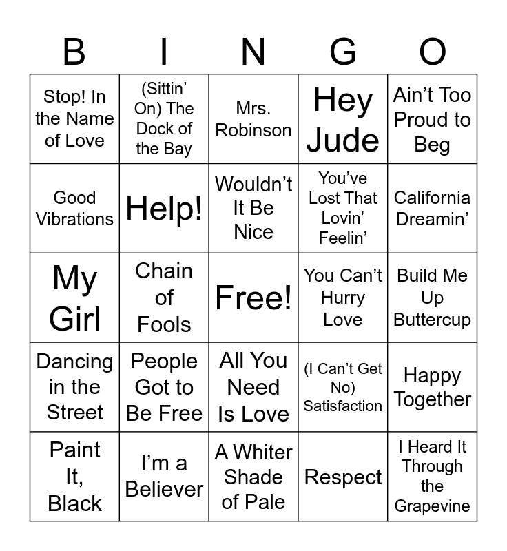 This bingo card has a free space and 35 words: I Want to Hold Your Hand, She Loves You, Yesterday, Help!, All You Need Is Love, Hey Jude, Good Vibrations, California Girls, Wouldn’t It Be Nice, God Only Knows, My Girl, Ain’t Too Proud to Beg, Reach Out I’ll Be There, I Can’t Help Myself (Sugar Pie, Honey Bunch), Stop! In the Name of Love, You Can’t Hurry Love, Respect, Chain of Fools, Dancing in the Street, I Heard It Through the Grapevine, (I Can’t Get No) Satisfaction, Paint It, Black, Happy Together, I’m a Believer, Mrs. Robinson, California Dreamin’, Monday, Monday, Oh, Pretty Woman, You’ve Lost That Lovin’ Feelin’, Build Me Up Buttercup, Light My Fire, A Whiter Shade of Pale, People Got to Be Free, (Sittin’ On) The Dock of the Bay and Born to Be Wild.