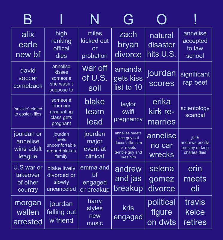This bingo card has 36 words: andrew and jas breakup, emma and bf engaged or breakup, kris engaged, david soccer comeback, jourdan or annelise wins adult league, taylor swift pregnancy, annelise kisses someone she wasn’t suppose to, harry styles new music, natural disaster hits U.S., selena gomez divorce, significant rap beef, zach bryan divorce, erin meets eli, someone from our graduating class gets pregnant, amanda gets kiss list to 10, alix earle new bf, U.S war or takeover of other country, erika kirk re-marries, “suicide”related to epstein files, miles kicked out or probation, blake team lead, jourdan feels uncomfortable around blakes family, annelise meets nice guy but doesn’t like him or meets terrible guy and likes him, jourdan major event at clinical, annelise no car wrecks, high ranking offical dies, jourdan scores, jourdan falling out w friend, war off of U.S. soil, annelise accepted to law school, travis kelce retires, morgan wallen arrested, julie andrews,pricilla presley or king charles dies, scientology scandal, blake lively divorced or slowly uncanceled and political figure on dwts.