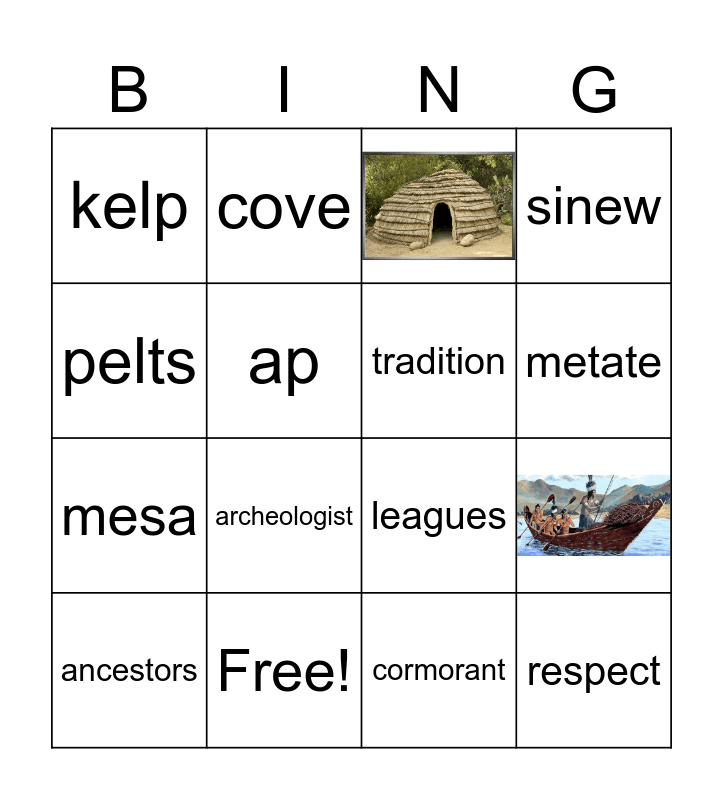 This bingo card has 2 images and 14 words: Free!, kelp, mesa, cove, leagues, cormorant, pelts, ap, ancestors, sinew, archeologist, metate, tradition and respect.