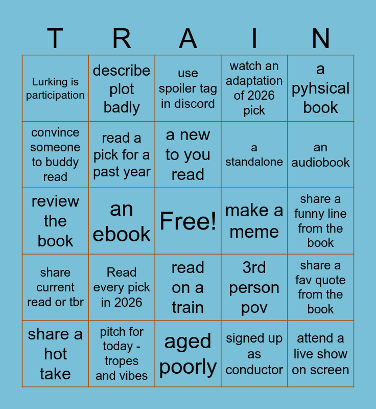 This bingo card has a free space and 42 words: a nostalgic to you read, a new to you read, read a sequel of any past pick, Read every pick in 2026, signed up as conductor, share a fav quote from the book, attend a live show on screen, attend a live show in chat, use spoiler tag in discord, read on a train, share a funny line from the book, an audiobook, an ebook, a pyhsical book, 1st person pov, 3rd person pov, multi pov, review the book, emoji summary, describe plot badly, convince someone to buddy read, if you like this - try this, post reading update, Lurking is participation, read within 48hrs of live show, a book with a favorite trope, a standalone, blue on the cover, YA cliche, a trope you hate, try 1st chapter of pick you don't plan to read, share current read or tbr, read a pick for a past year, aged poorly, still hold up, share a hot take, pitch for today - tropes and vibes, make a meme, fan cast, share/listen to song or playlist that fits the book, watch an adaptation of 2026 pick and watch adaptation of past pick.