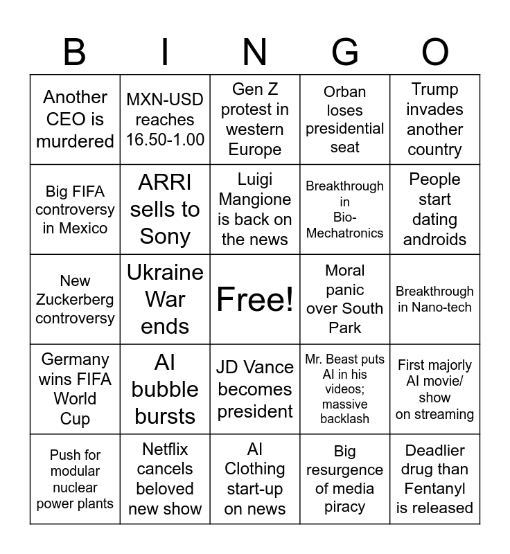 This bingo card has a free space and 24 words: AI bubble bursts, Netflix cancels beloved new show, Luigi Mangione is back on the news, Push for modular nuclear power plants, Trump invades another country, Another CEO is murdered, Big FIFA controversy in Mexico, MXN-USD reaches 16.50-1.00, Moral panic over South Park, JD Vance becomes president, Breakthrough in Bio-Mechatronics, New Zuckerberg controversy, Mr. Beast puts AI in his videos; massive backlash, First majorly AI movie/ show on streaming, ARRI sells to Sony, Big resurgence of media piracy, Breakthrough in Nano-tech, Gen Z protest in western Europe, People start dating androids, Ukraine War ends, Deadlier drug than Fentanyl is released, Germany wins FIFA World Cup, Orban loses presidential seat and AI Clothing start-up on news.