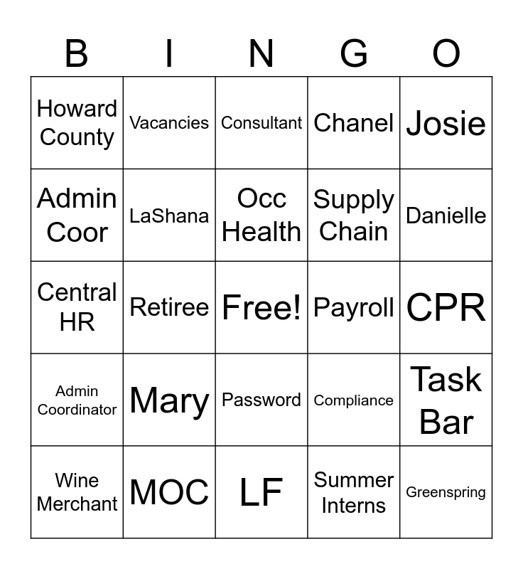This bingo card has a free space and 34 words: SCRUBS, Summer Interns, Labor Collaborative, AJ, Admin Coordinator, LaShana, Josie, Wine Merchant, Vacancies, Toni, Occ Health, Consultant, Conversion, Agency, Payroll, Danielle, MOC, Central HR, Mary, Compliance, Password, SOM, Howard County, CPR, LF, Greenspring, Chanel, VRC, Supply Chain, Admin Coor, EPIC, Retiree, Task Bar and Assignment Request.