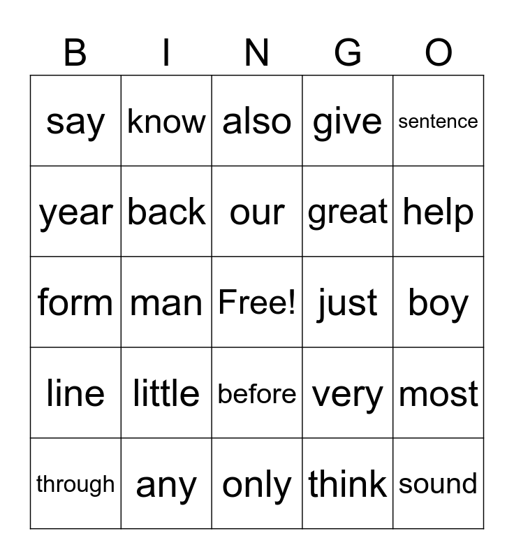 This bingo card has a free space and 48 words: new, sound, take, only, little, work, know, place, year, live, back, give, most, very, after, thing, our, just, name, sentence, man, think, say, great, where, help, through, much, before, line, right, too, mean, old, any, same, tell, boy, follow, came, want, show, also, around, form, three, small and set.