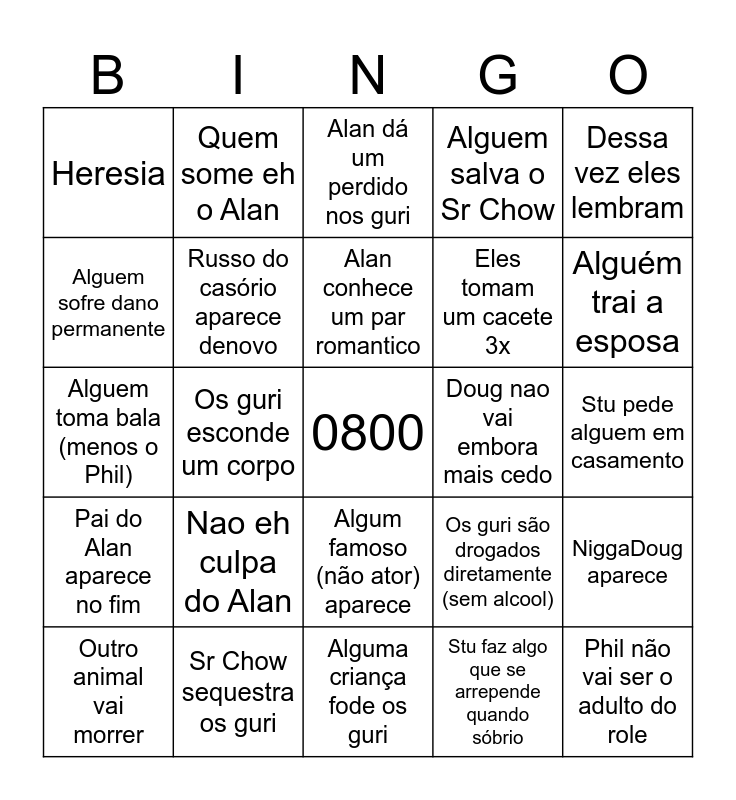 This bingo card has a free space and 24 words: Nao eh culpa do Alan, Sr Chow sequestra os guri, Alan conhece um par romantico, Outro animal vai morrer, Dessa vez eles lembram, Heresia, Alguem sofre dano permanente, Quem some eh o Alan, Doug nao vai embora mais cedo, Algum famoso (não ator) aparece, Eles tomam um cacete 3x, Alguem toma bala (menos o Phil), Os guri são drogados diretamente (sem alcool), NiggaDoug aparece, Russo do casório aparece denovo, Stu faz algo que se arrepende quando sóbrio, Stu pede alguem em casamento, Alan dá um perdido nos guri, Alguém trai a esposa, Os guri esconde um corpo, Phil não vai ser o adulto do role, Pai do Alan aparece no fim, Alguem salva o Sr Chow and Alguma criança fode os guri.