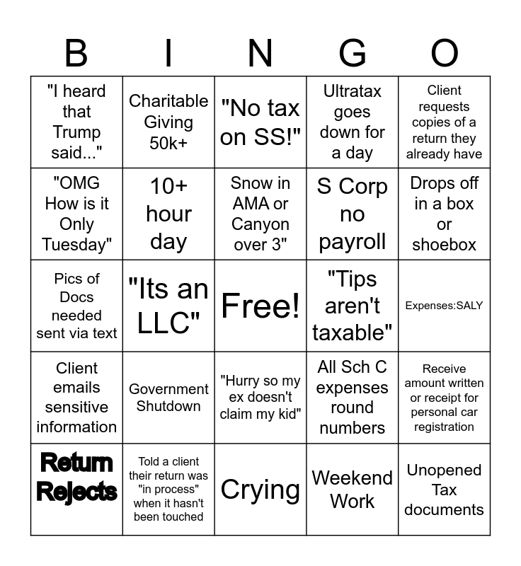 This bingo card has a free space and 29 words: Return Rejects, "I don't have a 1095-A this year" but in fact does, "Its an LLC", Client has questions AFTER E-file, "I heard that Trump said...", "No tax on SS!", 10+ hour day, Government Shutdown, "Tips aren't taxable", Told a client their return was "in process" when it hasn't been touched, Expenses:SALY, Unopened Tax documents, Crying, Weekend Work, Drops off in a box or shoebox, Fired a client, "Hurry so my ex doesn't claim my kid", Client emails sensitive information, Client requests copies of a return they already have, Pics of Docs needed sent via text, All Sch C expenses round numbers, Client found or remembered another doc after return processed, S Corp no payroll, "OMG How is it Only Tuesday", Ultratax goes down for a day, Charitable Giving 50k+, Receive amount written or receipt for personal car registration, Snow in AMA or Canyon over 3" and Client provides all documentation (all at once).