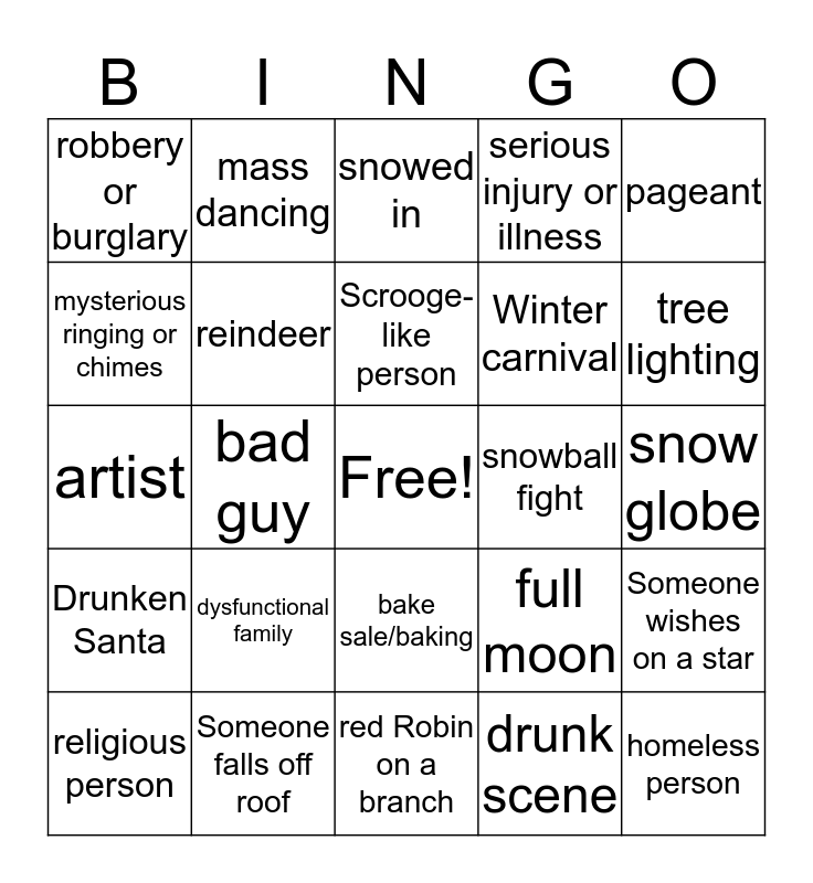This bingo card has a free space and 76 words: crying or tears, angel, snowed in, non-believer, carolers or choir, Santa Claus, ice skating, miracle moment, lost loved one, guilt trip, crazy elder, workaholic, Scrooge-like person, mysterious ringing or chimes, secret or scam, bad guy, pathetic Christmas Tree, homeless person, bell ringer, pageant, ultimate Christmas gift, artist, reindeer, mass dancing, serious injury or illness, flashback, holiday breakup, snowfall, car trouble or accident, jealous moment, unpaid bills, dinner disaster, Christmas Eve engagement, full moon, tree lighting, Winter carnival, mistletoe, twins, snow globe, drunk scene, Santa letter, handy man, financial crisis, homemade ornament, Secret Santa, frazzled parent, religious person, robbery or burglary, fashion or hair disaster, snowman, sleigh ride, bake sale/baking, moment of clarity or closure, orphan, holiday decoration competition, Crazy for Christmas, fruitcake, slo-mo scene, dream sequence, montage, dysfunctional family, candy cane, childhood disappointment, deadline, mistaken identity, elf, snowball fight, lost/need directions, meeting by collision, Presents get ruined, Someone wishes on a star, Drunken Santa, Someone falls off roof, a white Christmas, red Robin on a branch and snowman melts.
