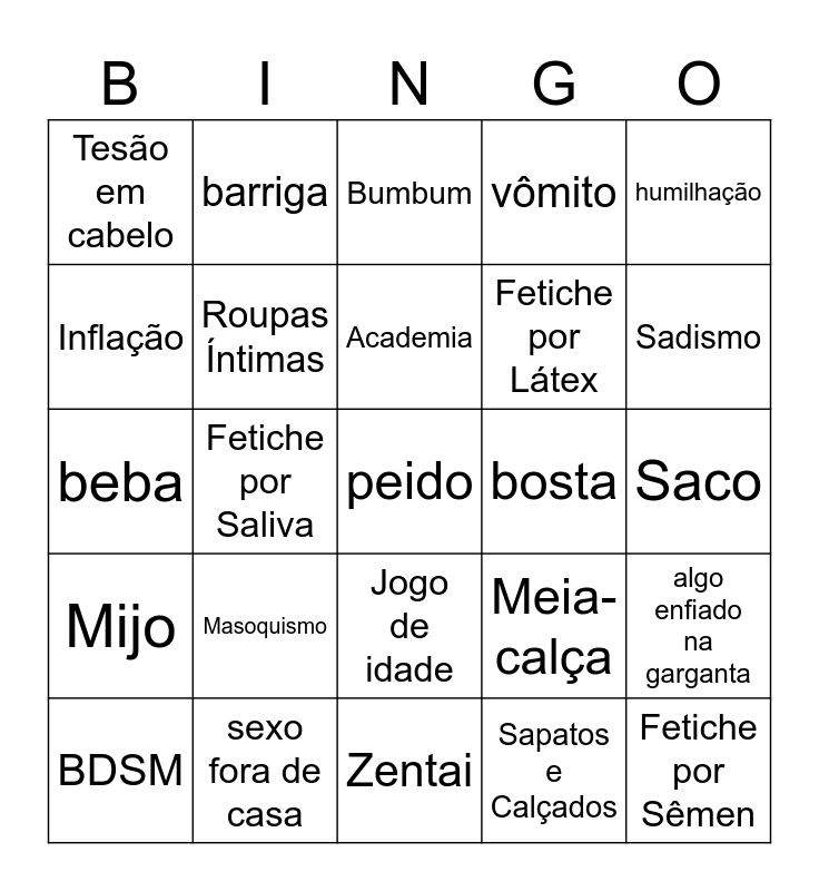 This bingo card has a free space and 24 words: Masoquismo, sexo fora de casa, Academia, BDSM, humilhação, Tesão em cabelo, Inflação, barriga, bosta, Jogo de idade, Fetiche por Látex, beba, Meia-calça, algo enfiado na garganta, Roupas Íntimas, Sapatos e Calçados, Saco, Bumbum, Sadismo, Fetiche por Saliva, Fetiche por Sêmen, Mijo, vômito and Zentai.