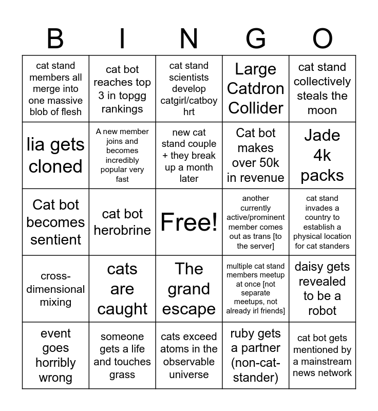This bingo card has a free space and 25 words: cats are caught, cats exceed atoms in the observable universe, new cat stand couple + they break up a month later, event goes horribly wrong, cat stand collectively steals the moon, cat stand members all merge into one massive blob of flesh, lia gets cloned, cat bot reaches top 3 in topgg rankings, another currently active/prominent member comes out as trans [to the server], The grand escape, Cat bot makes over 50k in revenue, Cat bot becomes sentient, multiple cat stand members meetup at once [not separate meetups, not already irl friends], daisy gets revealed to be a robot, A new member joins and becomes incredibly popular very fast, E becomes real, cat stand invades a country to establish a physical location for cat standers, cat stand scientists develop catgirl/catboy hrt, Jade 4k packs, cat bot herobrine, cat bot gets mentioned by a mainstream news network, someone gets a life and touches grass, cross-dimensional mixing, Large Catdron Collider and ruby gets a partner (non-cat-stander).