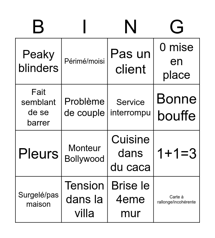 This bingo card has 16 words: Tension dans la villa, 1+1=3, Pas un client, Peaky blinders, Pleurs, Périmé/moisi, Cuisine dans du caca, Brise le 4eme mur, Fait semblant de se barrer, Problème de couple, Surgelé/pas maison, 0 mise en place, Monteur Bollywood, Bonne bouffe, Service interrompu and Carte à rallonge/incohérente.