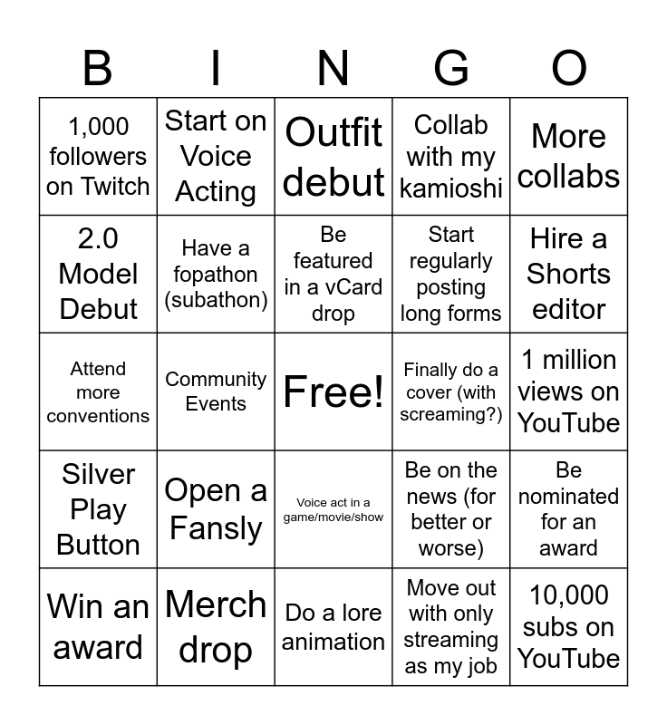 This bingo card has a free space and 30 words: Merch drop, Merch drop before July, Community Events, Achieving Partner, 1,000 followers on Twitch, Outfit debut, Have a fopathon (subathon), Voice act in a game/movie/show, Finally do a cover (with screaming?), Do a lore animation, 1 million views on YouTube, 10,000 subs on YouTube, Move out with only streaming as my job, Baking irl stream, Hire a Shorts editor, Partner with Gamer Supps, Be on the news (for better or worse), Silver Play Button, Open a Fansly, More collabs, Attend more conventions, See a cosplay of Soleil, Start on Voice Acting, Start regularly posting long forms, 2.0 Model Debut, Collab with my kamioshi, Be nominated for an award, Win an award, Be featured in a vCard drop and Get a plushy of me or Foppus~.