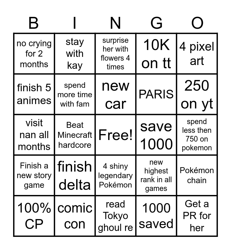 This bingo card has a free space and 24 words: 100% CP, finish delta, new car, 1000 saved, 4 pixel art, no crying for 2 months, stay with kay, surprise her with flowers 4 times, save 1000, spend less then 750 on pokemon, visit nan all months, spend more time with fam, new highest rank in all games, Pokémon chain, finish 5 animes, comic con, read Tokyo ghoul re, 10K on tt, 250 on yt, Finish a new story game, Beat Minecraft hardcore, 4 shiny legendary Pokémon, PARIS and Get a PR for her.