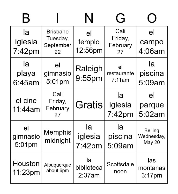 This bingo card has a free space and 175 words: la biblioteca 2:37am, el café 3:21am, el campo 4:06am, la mezquita 4:30am, el parque 5:02am, la piscina 5:09am, la playa 6:45am, el restaurante 7:11am, la sinagoga 7:15am, el trabajo 8:39am, la casa 9:32am, el centro comercial 10:17am, el cine 11:44am, el templo 12:56pm, las montanas 3:17pm, el gimnasio 5:01pm, la iglesia 7:42pm, la escuela 8pm, Jersey City 8:09pm, Raleigh 9:55pm, Lincoln 10:48pm, Houston 11:23pm, Scottsdale noon, Memphis midnight, Albuquerque about 6pm, Tucson Sunday, January 18, Kansas City Tuesday, January 20, Cali Friday, February 27, Beijing Wednesday, May 20, Phnom Penh Friday, July 31, Saint Petersburg Monday, August 17, Brisbane Tuesday, September 22, Casablanca Thursday, November 26, Sydney Friday, December 11, Hyderabad Sunday, December 27, Tucson Sunday, January 18, Kansas City Tuesday, January 20, Cali Friday, February 27, Beijing Wednesday, May 20, Phnom Penh Friday, July 31, Saint Petersburg Monday, August 17, Brisbane Tuesday, September 22, Casablanca Thursday, November 26, Sydney Friday, December 11, Hyderabad Sunday, December 27, la biblioteca 2:37am, el café 3:21am, el campo 4:06am, la mezquita 4:30am, el parque 5:02am, la piscina 5:09am, la playa 6:45am, el restaurante 7:11am, la sinagoga 7:15am, el trabajo 8:39am, la casa 9:32am, el centro comercial 10:17am, el cine 11:44am, el templo 12:56pm, las montanas 3:17pm, el gimnasio 5:01pm, la iglesia 7:42pm, la escuela 8pm, Jersey City 8:09pm, Raleigh 9:55pm, Lincoln 10:48pm, Houston 11:23pm, Scottsdale noon, Memphis midnight, Albuquerque about 6pm, la biblioteca 2:37am, el café 3:21am, el campo 4:06am, la mezquita 4:30am, el parque 5:02am, la piscina 5:09am, la playa 6:45am, el restaurante 7:11am, la sinagoga 7:15am, el trabajo 8:39am, la casa 9:32am, el centro comercial 10:17am, el cine 11:44am, el templo 12:56pm, las montanas 3:17pm, Tucson Sunday, January 18, Kansas City Tuesday, January 20, Cali Friday, February 27, Beijing Wednesday, May 20, Phnom Penh Friday, July 31, Saint Petersburg Monday, August 17, Brisbane Tuesday, September 22, Casablanca Thursday, November 26, Sydney Friday, December 11, Hyderabad Sunday, December 27, el gimnasio 5:01pm, la iglesia 7:42pm, la escuela 8pm, Jersey City 8:09pm, Raleigh 9:55pm, Lincoln 10:48pm, Houston 11:23pm, Scottsdale noon, Memphis midnight, Albuquerque about 6pm, Saint Petersburg Monday, August 17, Brisbane Tuesday, September 22, Casablanca Thursday, November 26, Sydney Friday, December 11, Hyderabad Sunday, December 27, la biblioteca 2:37am, el café 3:21am, el campo 4:06am, la mezquita 4:30am, el parque 5:02am, la piscina 5:09am, la playa 6:45am, el restaurante 7:11am, la sinagoga 7:15am, el trabajo 8:39am, la casa 9:32am, el centro comercial 10:17am, el cine 11:44am, el templo 12:56pm, las montanas 3:17pm, el gimnasio 5:01pm, la iglesia 7:42pm, la escuela 8pm, Jersey City 8:09pm, Raleigh 9:55pm, Lincoln 10:48pm, Houston 11:23pm, Scottsdale noon, Memphis midnight, Albuquerque about 6pm, Tucson Sunday, January 18, Kansas City Tuesday, January 20, Cali Friday, February 27, Beijing Wednesday, May 20, Phnom Penh Friday, July 31, la escuela 8pm, Jersey City 8:09pm, Raleigh 9:55pm, Lincoln 10:48pm, Houston 11:23pm, Albuquerque about 6pm, Tucson Sunday, January 18, Kansas City Tuesday, January 20, Cali Friday, February 27, Beijing Wednesday, May 20, Phnom Penh Friday, July 31, Saint Petersburg Monday, August 17, Brisbane Tuesday, September 22, Casablanca Thursday, November 26, Sydney Friday, December 11, Hyderabad Sunday, December 27, la biblioteca 2:37am, el café 3:21am, el campo 4:06am, la mezquita 4:30am, el parque 5:02am, la piscina 5:09am, la playa 6:45am, el restaurante 7:11am, la sinagoga 7:15am, el trabajo 8:39am, la casa 9:32am, el centro comercial 10:17am, el cine 11:44am, el templo 12:56pm, las montanas 3:17pm, el gimnasio 5:01pm, la iglesia 7:42pm, Scottsdale noon and Memphis midnight.