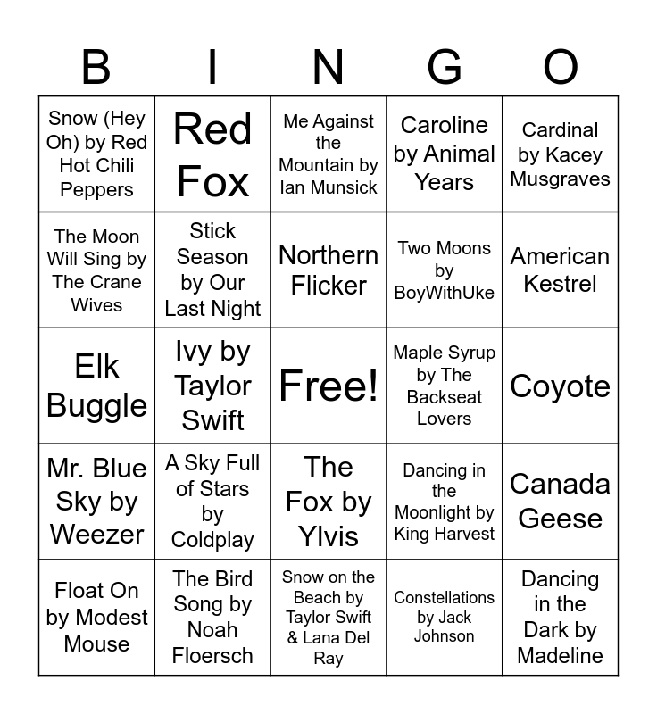 This bingo card has a free space and 56 words: Snow by Zach Bryan, Float On by Modest Mouse, Snowman by Sia, Snow (Hey Oh) by Red Hot Chili Peppers, Snow on the Beach by Taylor Swift & Lana Del Ray, Chasing Cars by Snow Patrol, Stick Season by Our Last Night, Saturday Sun by Vance Joy, Two Moons by BoyWithUke, Never Seen the Rain by Tones and I, Caroline by Animal Years, Tumbleweed by Noah Rinker, Hold Me Down by Kingfishr, Evergreen by Richy Mitch & The Coal Miners, I’m Like A Bird by Nelly Furtado, Wildfire by John Mayer, Cardinal by Kacey Musgraves, Ivy by Taylor Swift, Winter Song by Ingrid Michaelson & Sara Bareilles, Dancing in the Dark by Madeline, Maple Syrup by The Backseat Lovers, Cardinal by Mt. Joy, Dancing in the Moonlight by King Harvest, Me Against the Mountain by Ian Munsick, Northern Cardinal, Northern Flicker, Shrike by Hozier, Red-tailed Hawk, American Kestrel, Blue Jay, Bald Eagle, Fly Away by Lenny Kravitz, Edge of Seventeen by Stevie Nicks, Feather by Sabrina Carpenter, Coyote, The Moon Will Sing by The Crane Wives, Elk Buggle, Fox Hunt by Sierra Ferrell, Mr. Blue Sky by Weezer, Red Fox, The Fox by Ylvis, Talking to the Moon by Bruno Mars, The Woods by Hollow Coves, Bad Moon Rising by Creedence Clearwater Revival, Here Comes the Sun by The Beatles, A Sky Full of Stars by Coldplay, The Bird Song by Noah Floersch, Do I Wanna Know? By Arctic Monkeys, Shake the Frost by Tyler Childers, Barred Owl, Constellations by Jack Johnson, Fluorescent Adolescent by Arctic Monkeys, Dear Winter by AJR, Pink Skies by Zach Bryan, Canada Geese and Belted Kingfisher.