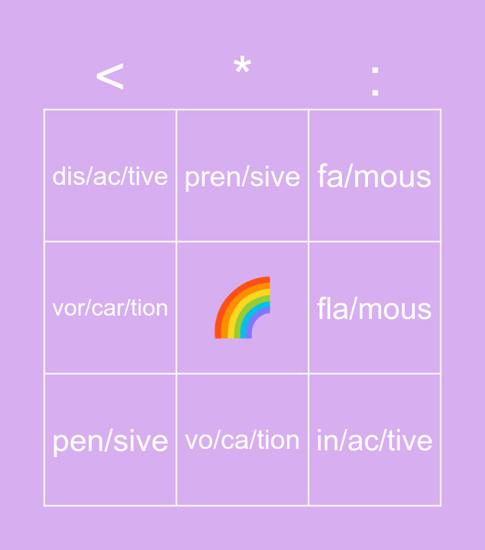 This bingo card has a free space and 8 words: fla/mous, fa/mous, pren/sive, pen/sive, dis/ac/tive, in/ac/tive, vor/car/tion and vo/ca/tion.