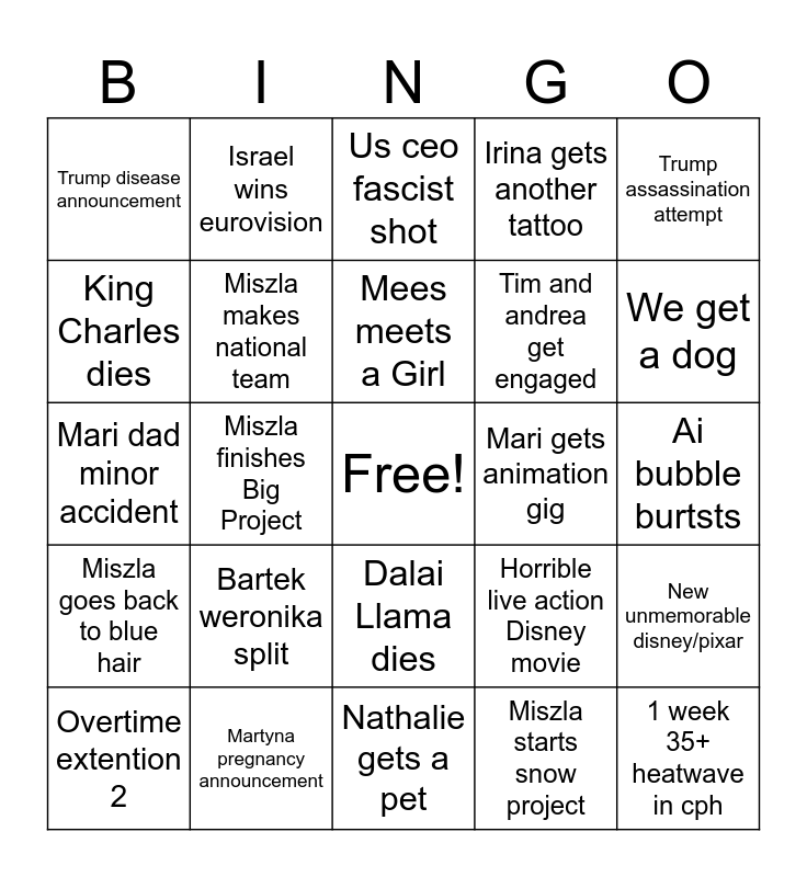 This bingo card has a free space and 24 words: Bartek weronika split, Martyna pregnancy announcement, Mees meets a Girl, Overtime extention 2, Trump assassination attempt, Trump disease announcement, King Charles dies, Israel wins eurovision, Mari gets animation gig, Dalai Llama dies, Tim and andrea get engaged, Mari dad minor accident, Horrible live action Disney movie, New unmemorable disney/pixar, Miszla makes national team, Miszla starts snow project, Ai bubble burtsts, Us ceo fascist shot, We get a dog, Miszla finishes Big Project, 1 week 35+ heatwave in cph, Miszla goes back to blue hair, Irina gets another tattoo and Nathalie gets a pet.