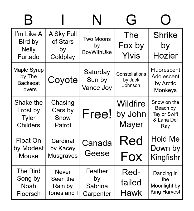 This bingo card has a free space and 56 words: Bad Moon Rising by Creedence Clearwater Revival, The Bird Song by Noah Floersch, Do I Wanna Know? By Arctic Monkeys, I’m Like A Bird by Nelly Furtado, Feather by Sabrina Carpenter, Dancing in the Dark by Madeline, Coyote, Evergreen by Richy Mitch & The Coal Miners, Constellations by Jack Johnson, Winter Song by Ingrid Michaelson & Sara Bareilles, The Fox by Ylvis, Snow (Hey Oh) by Red Hot Chili Peppers, Dear Winter by AJR, American Kestrel, The Woods by Hollow Coves, Here Comes the Sun by The Beatles, Shrike by Hozier, Chasing Cars by Snow Patrol, Barred Owl, Dancing in the Moonlight by King Harvest, Wildfire by John Mayer, Snow by Zach Bryan, Red Fox, Two Moons by BoyWithUke, Pink Skies by Zach Bryan, Saturday Sun by Vance Joy, Belted Kingfisher, Ivy by Taylor Swift, Fluorescent Adolescent by Arctic Monkeys, Snowman by Sia, Me Against the Mountain by Ian Munsick, Stick Season by Our Last Night, Northern Flicker, Mr. Blue Sky by Weezer, Snow on the Beach by Taylor Swift & Lana Del Ray, Maple Syrup by The Backseat Lovers, Shake the Frost by Tyler Childers, Talking to the Moon by Bruno Mars, Float On by Modest Mouse, A Sky Full of Stars by Coldplay, Canada Geese, Caroline by Animal Years, Fly Away by Lenny Kravitz, The Moon Will Sing by The Crane Wives, Tumbleweed by Noah Rinker, Cardinal by Kacey Musgraves, Never Seen the Rain by Tones and I, Fox Hunt by Sierra Ferrell, Blue Jay, Cardinal by Mt. Joy, Red-tailed Hawk, Bald Eagle, Northern Cardinal, Elk Buggle, Hold Me Down by Kingfishr and Edge of Seventeen by Stevie Nicks.