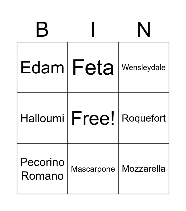 This bingo card has a free space and 20 words: Brie, Camembert, Wensleydale, Stilton, Cheddar, Mozzarella, Gouda, Edam, Red Leicester, Feta, Ricotta, Guyere, Roquefort, Parmigianno Reggiano, Pecorino Romano, Waxaca, Mascarpone, Halloumi, Monterey Jack and Vegan Cheese.