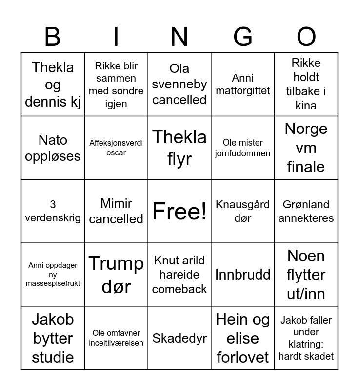 This bingo card has a free space and 24 words: Trump dør, Ole omfavner inceltilværelsen, Thekla flyr, Jakob bytter studie, Rikke holdt tilbake i kina, Thekla og dennis kj, Nato oppløses, Rikke blir sammen med sondre igjen, Knausgård dør, Knut arild hareide comeback, Ole mister jomfudommen, 3 verdenskrig, Innbrudd, Noen flytter ut/inn, Affeksjonsverdi oscar, Hein og elise forlovet, Grønland annekteres, Ola svenneby cancelled, Norge vm finale, Mimir cancelled, Jakob faller under klatring: hardt skadet, Anni oppdager ny massespisefrukt, Anni matforgiftet and Skadedyr.