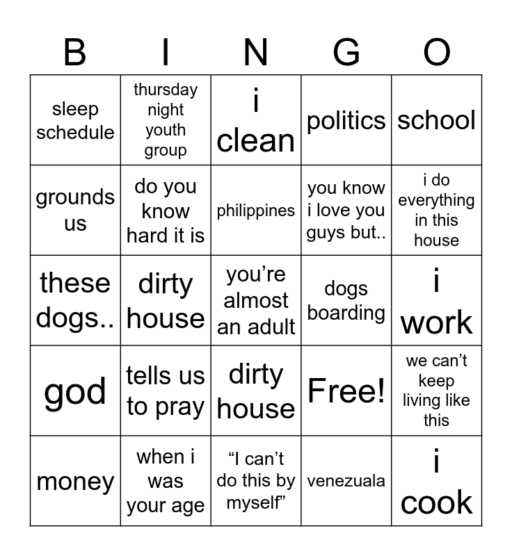 This bingo card has 25 words: tells us to pray, “I can’t do this by myself”, philippines, money, school, sleep schedule, grounds us, thursday night youth group, dogs boarding, dirty house, you know i love you guys but.., these dogs.., Free!, we can’t keep living like this, do you know hard it is, i cook, i work, i clean, i do everything in this house, dirty house, you’re almost an adult, when i was your age, god, politics and venezuala.