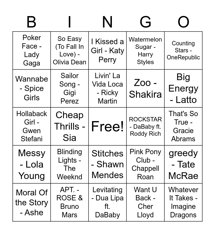 This bingo card has a free space and 79 words: Timber - Pitbull ft. Kesha, As It Was - Harry Styles, I Kissed a Girl - Katy Perry, Shake It - Metro Station, Bad Romance - Lady Gaga, Tik Tok - Kesha, Shape of You - Ed Sheeran, Call Me Maybe - Carly Rae Jepsen, HUMBLE - Kendrick Lamar, Shake It Off - Taylor Swift, Flowers - Miley Cyrus, Since U Been Gone - Kelly Clarkson, Watermelon Sugar - Harry Styles, Poker Face - Lady Gaga, Despacito - Luis Fonsi & Daddy Yankee, Wannabe - Spice Girls, Uptown Funk - Mark Ronson ft. Bruno Mars, Blinding Lights - The Weeknd, Empire State of Mind - Jay-Z & Alicia Keys, That's So True - Gracie Abrams, Rock Your Body - Justin Timberlake, Counting Stars - OneRepublic, Hollaback Girl - Gwen Stefani, Livin' La Vida Loca - Ricky Martin, Sailor Song - Gigi Perez, Million Dollar Baby - Tommy Richman, Espresso - Sabrina Carpenter, drivers license - Olivia Rodrigo, Dance The Night - Dua Lipa, Boy's a Liar - PinkPantheress, Big Energy - Latto, Stay - The Kid LAROI ft. Justin Bieber, Levitating - Dua Lipa ft. DaBaby, Up - Cardi B, Moral Of the Story - Ashe, ROCKSTAR - DaBaby ft. Roddy Rich, Break Free - Ariana Grande & Zedd, Havana - Camila Cabello ft. Young Thug, You Make It Easy - Jason Aldean, Whatever It Takes - Imagine Dragons, Issues - Julia Michaels, 24K Magic - Bruno Mars, Too Good - Drake & Rihanna, The Greatest - Sia, BIRDS OF A FEATHER - Billie Eilish, So Easy (To Fall In Love) - Olivia Dean, Manchild - Sabrina Carpenter, Beautiful Things - Benson Boone, Ordinary - Alex Warren, Stargazing - Myles Smith, greedy - Tate McRae, Cheap Thrills - Sia, Pink Pony Club - Chappell Roan, Rolling in the Deep - Adele, I Had Some Help - Post Malone ft. Morgan Wallen, Bills, Bills, Bills - Destiny's Child, Abracadabra - Lady Gaga, Tonight Tonight - Hot Chella Rae, Girlfriend - Avril Lavigne, Stitches - Shawn Mendes, Zoo - Shakira, DAISIES - Justin Bieber, Sugar On My Tongue - Tyler, The Creator, Die With A Smile - Lady Gaga & Bruno Mars, Mama Said - Lukas Graham, Electric Love - BORNS, Let's Get It Started - Black Eyed Peas, The Monster - Eminem & Rihanna, The Lazy Song - Bruno Mars, Messy - Lola Young, APT. - ROSE & Bruno Mars, Too Sweet - Hozier, Lose Control - Teddy Swims, Sweater Weather - The Neighbourhood, Super Bass - Nicki Minaj, Want U Back - Cher Lloyd, Touch - Katseye, 7 rings - Ariana Grande and Low - Flo Rida ft. T-Pain.