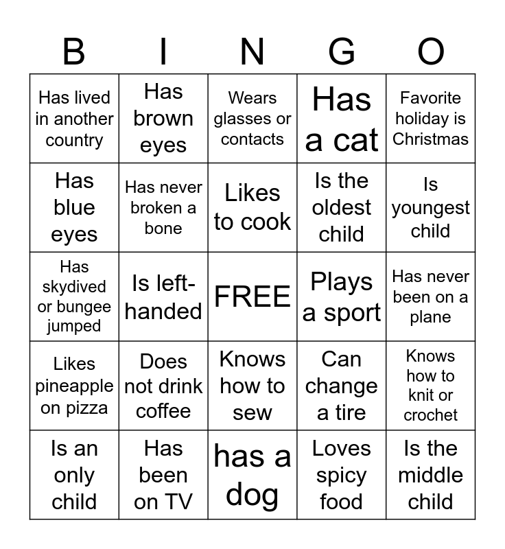 This bingo card has a free space and 39 words: Went on vacation this summer, Has the same birth month as you, Has lived in Minnesota their whole live, Has never broken a bone, Is an only child, Knows how to sew, Likes to cook, Can play a musical instrument, Favorite holiday is Christmas, Likes pineapple on pizza, Is left-handed, Has a cat, Is the middle child, Has never been on a plane, Plays a sport, Does not drink coffee, Can speak more than one language, Has lived in another country, Is a morning person, Can change a tire, Has blue eyes, has a dog, Is the oldest child, Is youngest child, Has green eyes, Likes scary movies, Is a night owl, Drives a blue car, Has met someone famous, Has brown eyes, Has 2 or more siblings, Is a twin, Wears glasses or contacts, Has been on TV, Loves spicy food, Has a pet besides a cat or dog, Knows how to knit or crochet, Has skydived or bungee jumped and Has a tattoo.