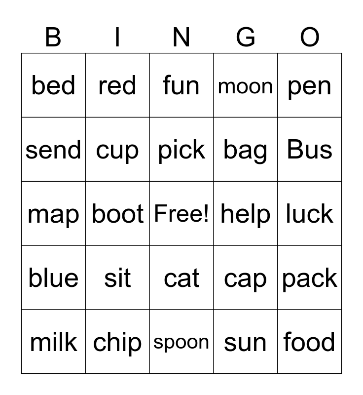 This bingo card has a free space and 24 words: sit, chip, pick, milk, pen, bed, send, red, help, cat, bag, map, cap, pack, cup, sun, luck, fun, Bus, boot, food, blue, moon and spoon.