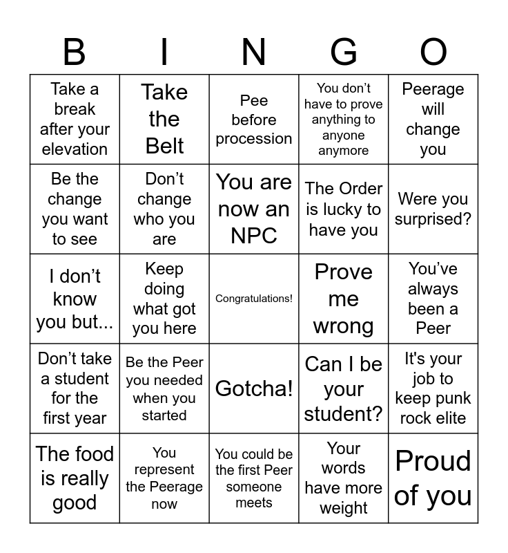 This bingo card has a free space and 32 words: Your words have more weight, Apologize louder than you fart, Keep doing what got you here, Take the Baldric, Don’t take a student for the first year, Don’t change who you are, Peerage will change you, It's your job to keep punk rock elite, Take the Belt, Say yes, You are now an NPC, Pee before procession, I have no idea what to say, Prove me right, Prove me wrong, Don't lick the scroll, The food is really good, I don’t know you but..., Gotcha!, Be the Peer you needed when you started, Can I be your student?, I didn't vote for you, You’ve always been a Peer, You represent the Peerage now, Proud of you, You don’t have to prove anything to anyone anymore, The Order is lucky to have you, Be the change you want to see, Take a break after your elevation, You could be the first Peer someone meets, I’ve always looked up to you and Were you surprised?.
