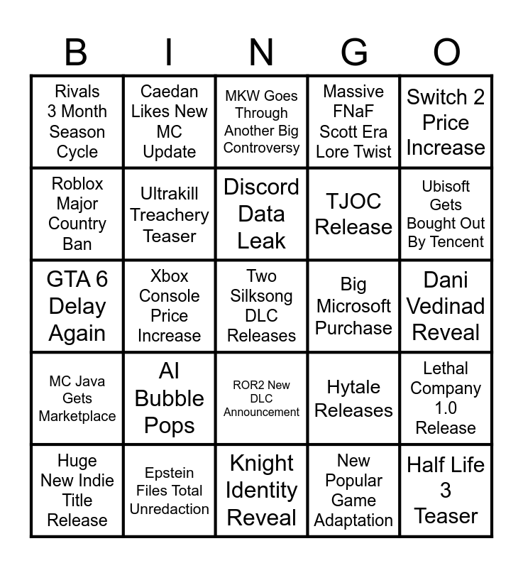 This bingo card has 25 words: AI Bubble Pops, Knight Identity Reveal, Discord Data Leak, Huge New Indie Title Release, Switch 2 Price Increase, Rivals 3 Month Season Cycle, Roblox Major Country Ban, Caedan Likes New MC Update, Big Microsoft Purchase, ROR2 New DLC Announcement, TJOC Release, GTA 6 Delay Again, Hytale Releases, Lethal Company 1.0 Release, Ultrakill Treachery Teaser, Half Life 3 Teaser, Dani Vedinad Reveal, MKW Goes Through Another Big Controversy, Ubisoft Gets Bought Out By Tencent, Xbox Console Price Increase, Two Silksong DLC Releases, Epstein Files Total Unredaction, MC Java Gets Marketplace, Massive FNaF Scott Era Lore Twist and New Popular Game Adaptation.