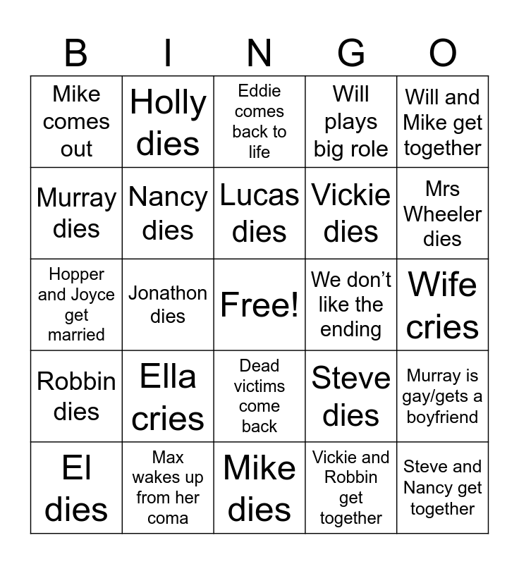 This bingo card has a free space and 24 words: El dies, Ella cries, Lucas dies, Vickie and Robbin get together, Will and Mike get together, Mike comes out, Holly dies, Eddie comes back to life, We don’t like the ending, Wife cries, Hopper and Joyce get married, Nancy dies, Steve dies, Murray is gay/gets a boyfriend, Murray dies, Max wakes up from her coma, Mike dies, Will plays big role, Mrs Wheeler dies, Robbin dies, Jonathon dies, Dead victims come back, Vickie dies and Steve and Nancy get together.