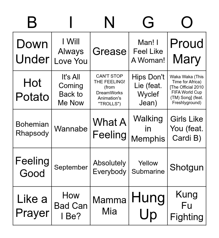 This bingo card has 76 words: Buffalo Soldier, Beat It, Grease, Roar, Young Hearts Run Free, Believe, Wake Me Up Before You Go-Go, Dancing Queen, YMCA, Don't Stop Believin' (2022 Remaster), Kung Fu Fighting, Sweet Caroline, CAN'T STOP THE FEELING! (from DreamWorks Animation's "TROLLS"), Hot Potato, All About That Bass, Wannabe, Like a Prayer, What A Feeling, Summer Of '69, Proud Mary, Livin' On A Prayer, Bohemian Rhapsody, It's All Coming Back to Me Now, I Will Always Love You, Man! I Feel Like A Woman!, ...Baby One More Time, Single Ladies (Put a Ring on It), Gimme! Gimme! Gimme! (A Man After Midnight), Shake It Off, Valerie (feat. Amy Winehouse) - Version Revisited, Gonna Make You Sweat (Everybody Dance Now) (feat. Freedom Williams), Party In The U.S.A., Call Me Maybe, Yellow Submarine, Waka Waka (This Time for Africa) [The Official 2010 FIFA World Cup (TM) Song] (feat. Freshlyground), Hips Don't Lie (feat. Wyclef Jean), I Will Survive, Just Dance, Girls Like You (feat. Cardi B), Hung Up, On Top Of The World, Genie In a Bottle, Hey Ya!, I'm Coming Out, Zombie, Don't You Want Me, Like a Prayer, Down Under, Torn, Never Tear Us Apart, Love Is in the Air, Absolutely Everybody, Suspicious Minds, You Can Call Me Al, That Don't Impress Me Much - International Mix, Nothing Compares 2 U, Tell It to My Heart, Everywhere - 2017 Remaster, Jolene, December, 1963 (Oh What a Night!), September, Rhythm Is a Dancer, Show Me Love, Sunny, Love Really Hurts Without You, Dreams, Walking in Memphis, My Way - 2008 Remastered, Somethin' Stupid, Imagine - Remastered 2010, Shotgun, Feeling Good, How Bad Can I Be?, Life is a Highway, Mamma Mia and I Wanna Dance with Somebody (Who Loves Me).