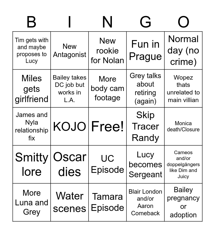 This bingo card has a free space and 24 words: Oscar dies, Water scenes, More body cam footage, More Luna and Grey, Normal day (no crime), Tim gets with and maybe proposes to Lucy, Miles gets girlfriend, New Antagonist, Skip Tracer Randy, UC Episode, Grey talks about retiring (again), James and Nyla relationship fix, Lucy becomes Sergeant, Cameos and/or doppelgängers like Dim and Juicy, Bailey takes DC job but works in L.A., Blair London and/or Aaron Comeback, Monica death/Closure, New rookie for Nolan, Wopez thats unrelated to main villian, KOJO, Bailey pregnancy or adoption, Smitty lore, Fun in Prague and Tamara Episode.