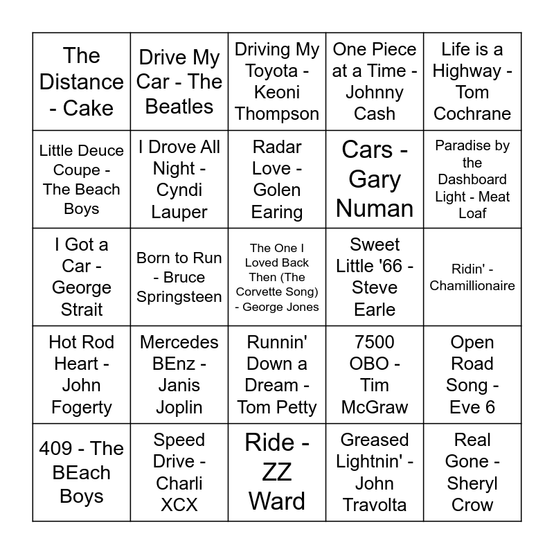 This bingo card has 64 words: Highway Star - Deep Purple, I'm In Love with My Car - Queen, Drive - Incubus, Open Road Song - Eve 6, Fun, Fun, Fun - The Beach Boys, Moonlight Drive - The Doors, Drive My Car - The Beatles, Low Rider - War, Radar Love - Golen Earing, Red Barchetta - RUSH, Runnin' Down a Dream - Tom Petty, Fast Car - Tracy Chapman, Ridin' - Chamillionaire, Life is a Highway - Tom Cochrane, Shut Up and Drive - Rihanna, Little Deuce Coupe - The Beach Boys, Born to Run - Bruce Springsteen, The Distance - Cake, No Particular Place to Go - Chuck Berry, Cars - Gary Numan, Mercedes BEnz - Janis Joplin, Hot Rod Heart - John Fogerty, One Piece at a Time - Johnny Cash, My Ol' Bronco - Luke Bryan, Fuel - Metallica, Ride Wit Me - Nelly, I'd Rather Ride Around with You - Reba McEntire, Route 66 - The Rolling Stones, I Can't Drive 55 - Sammy Hagar, In My Car (I'll Be the Driver) - Shania Twain, My Hooptie - Sir Mix-a-Lot, Brand New Cadillac - Vince Taylor & His Playboys, On the Road Again - Willie Nelson, Mustang Sally - Wilson Pickett, Paradise by the Dashboard Light - Meat Loaf, 409 - The BEach Boys, Chevrolet - Dustin Lynch ft. Jelly Roll, Greased Lightnin' - John Travolta, GTO - Ronny & The Daytonas, I Drove All Night - Cyndi Lauper, I Got a Car - George Strait, Sweet Little '66 - Steve Earle, Speed Demon - Michael Jackson, Mud on the Tires - Brad Paisley, Ol' 55 - Tom Waits, The One I Loved Back Then (The Corvette Song) - George Jones, Speed Drive - Charli XCX, Real Gone - Sheryl Crow, 7500 OBO - Tim McGraw, Crash - Gwen Stefani, Life in the Fast Lane - The Eagles, The Boomin' System - LL Cool J, Ride - ZZ Ward, Ride to Live, Live to Ride - Twisted Sister, SAAB 900 - Honey., My Truck - Breland, Driving My Toyota - Keoni Thompson, Rollin' in My Rolls - Moon Martin, Makin' Thunderbirds - Bob Seger, She Love My Automobile - ZZ Top, Heavy and Rolling - Mark Ronson ft. Andrew Wyatt, Crosstown Traffic - Jimi Hendrix, Roadhouse Blues - The Doors and I Miss That Whip - Anderson .Paak.