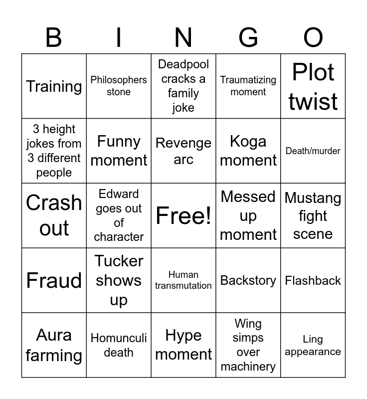 This bingo card has a free space and 24 words: Tucker shows up, Homunculi death, Revenge arc, Aura farming, Plot twist, Training, 3 height jokes from 3 different people, Philosophers stone, Messed up moment, Human transmutation, Koga moment, Crash out, Backstory, Flashback, Funny moment, Wing simps over machinery, Mustang fight scene, Deadpool cracks a family joke, Death/murder, Edward goes out of character, Ling appearance, Fraud, Traumatizing moment and Hype moment.
