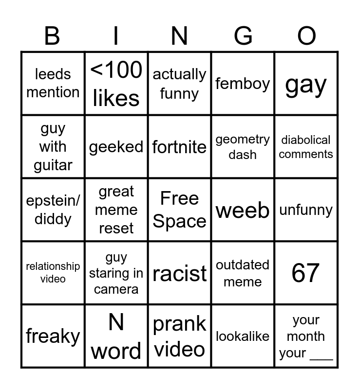 This bingo card has a free space and 24 words: guy staring in camera, N word, fortnite, freaky, gay, leeds mention, guy with guitar, <100 likes, weeb, racist, geometry dash, epstein/ diddy, outdated meme, 67, geeked, lookalike, unfunny, actually funny, diabolical comments, great meme reset, your month your ___, relationship video, femboy and prank video.
