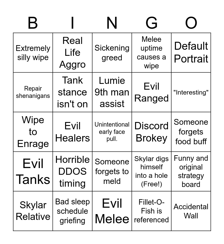 This bingo card has 25 words: Horrible DDOS timing, Evil Melee, Lumie 9th man assist, Skylar Relative, Default Portrait, Extremely silly wipe, Repair shenanigans, Real Life Aggro, Discord Brokey, Someone forgets to meld, Evil Ranged, Wipe to Enrage, Skylar digs himself into a hole (Free!), Funny and original strategy board, Tank stance isn't on, Accidental Wall, Someone forgets food buff, Sickening greed, "Interesting", Evil Healers, Unintentional early face pull., Bad sleep schedule griefing, Evil Tanks, Melee uptime causes a wipe and Fillet-O-Fish is referenced.