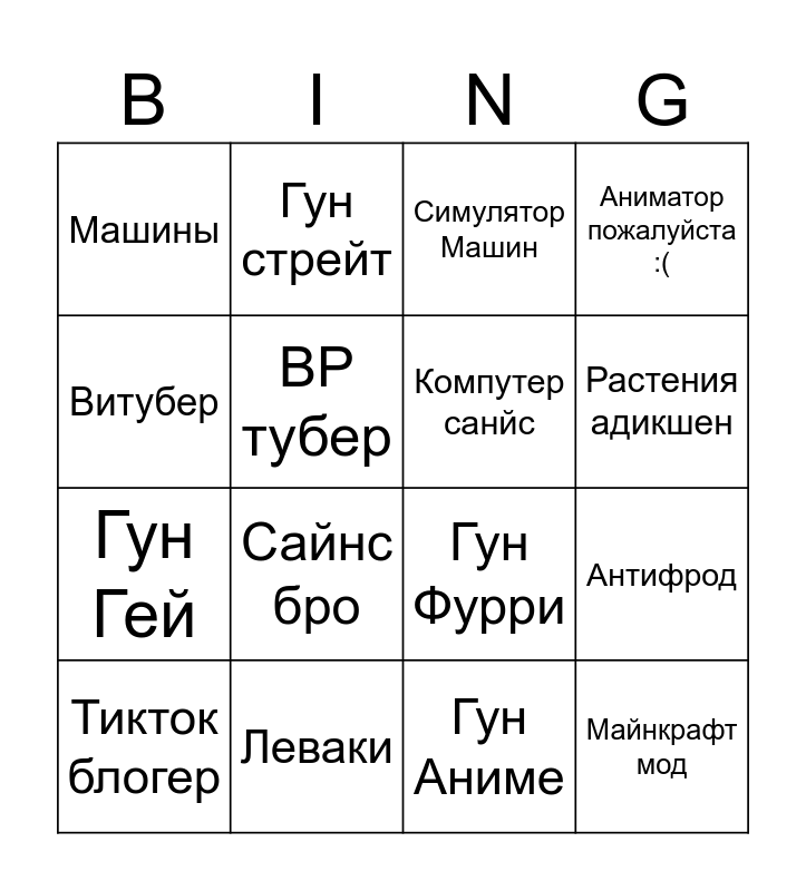 This bingo card has 16 words: Леваки, Антифрод, Симулятор Машин, Машины, Гун Гей, Гун стрейт, Гун Фурри, Гун Аниме, Витубер, ВР тубер, Тикток блогер, Аниматор пожалуйста :(, Сайнс бро, Растения адикшен, Компутер санйс and Майнкрафт мод.